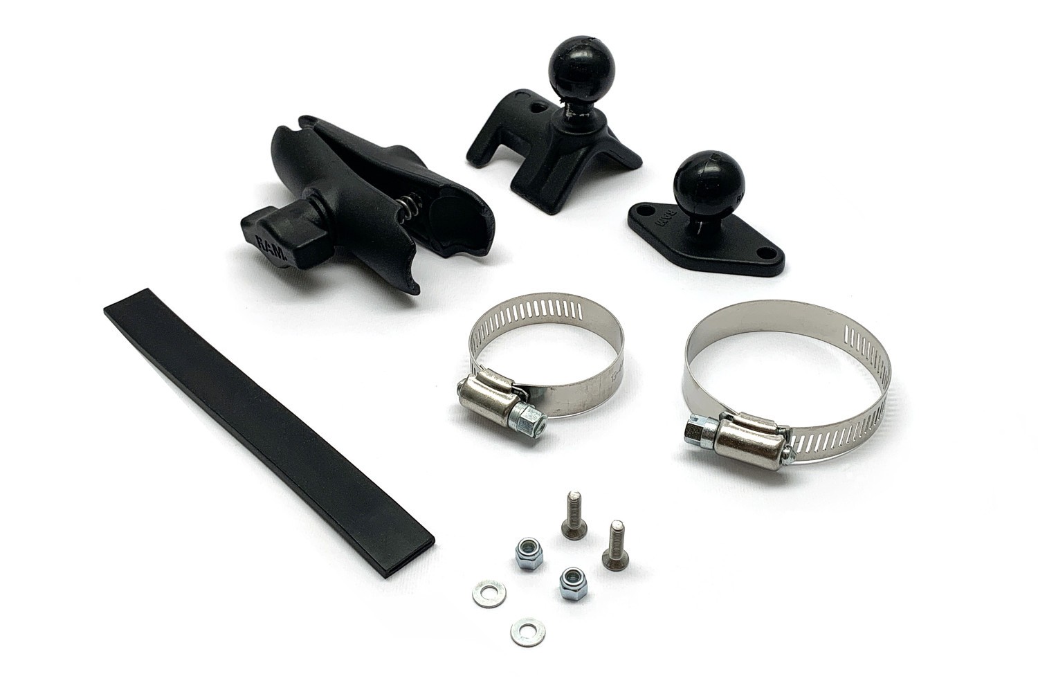 El kit contiene: brazo de 90 mm, soporte roll-bar, base de abrazadera con bola, contratuerca, abrazadera de tubo de 4,5 cm y 5,5 cm, goma de protección, tornillos y arandelas.