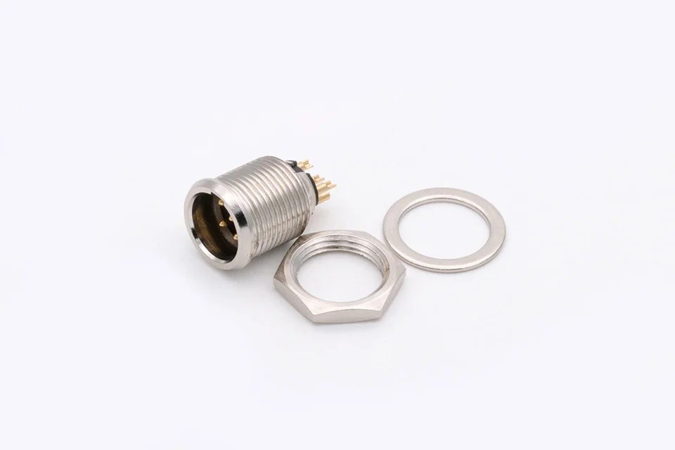 Conector Mini XLR 3 pin macho de montaje en panel extensamente utilizado en sistemas de radio Speedcom para conexión de PTT.